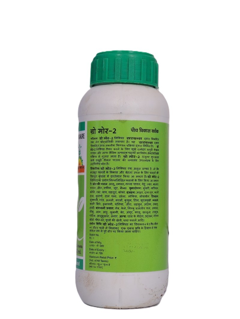 - यह एक प्राकृतिक चेलेटिंग एजेंट के रूप में कार्य करता है, जिससे मिट्टी में उपलब्ध पोषक तत्व पौधों के लिए अधिक सुलभ हो जाते हैं। Grow More 2 मिट्टी की संरचना को सुधारता है, जल धारण क्षमता को बढ़ाता है और लाभकारी सूक्ष्मजीवों की गतिविधि को प्रोत्साहित करता है।