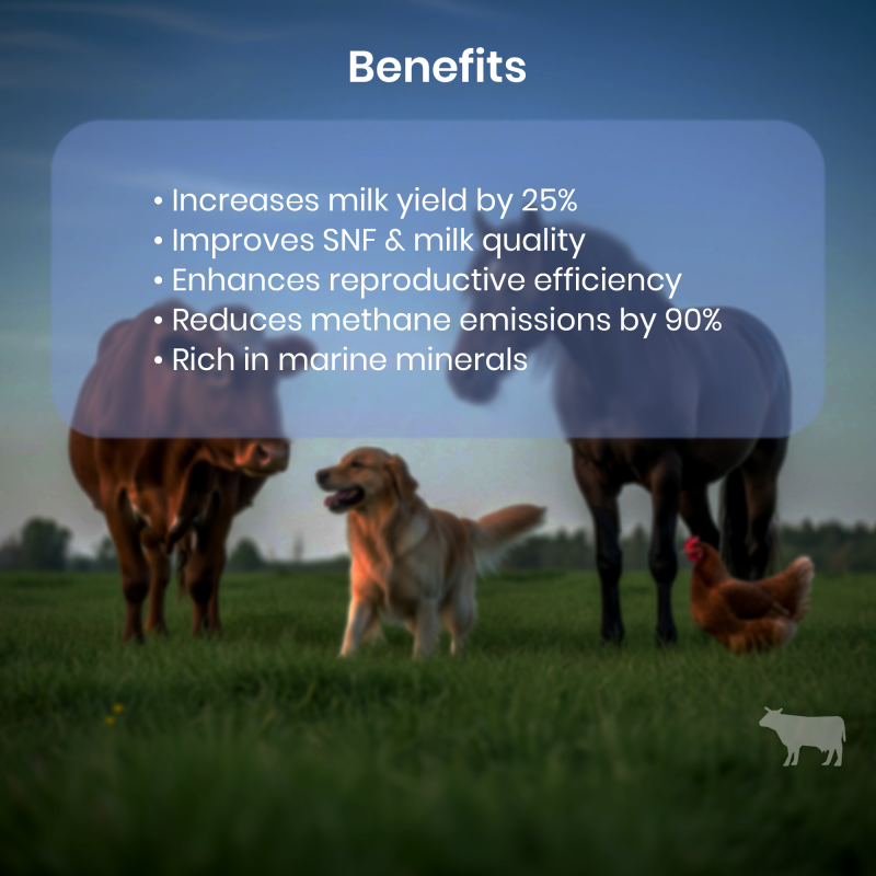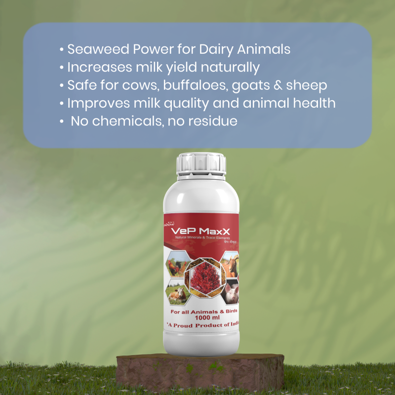 Vepmaxx is an advanced, marine algae-based feed supplement designed to improve the health and performance of dairy cattle, buffaloes, and other livestock. By enhancing milk yield, improving digestive efficiency, and reducing methane emissions, Vepmaxx promotes overall animal well-being. It's enriched with natural minerals and trace elements, supporting metabolic health, immunity, and fertility.